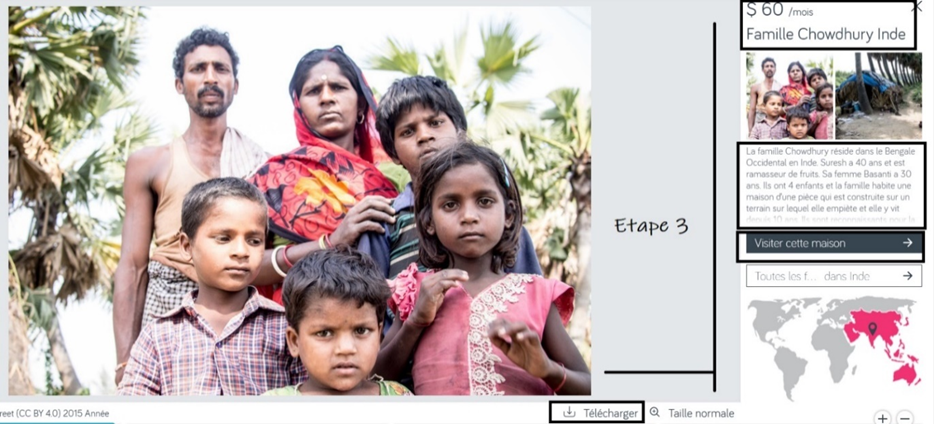 Etape 3 : Cliquez sur la famille choisie, notez son nom, son revenu mensuel, la ville dans laquelle elle habite ainsi que quelques éléments de sa biographie que vous jugez pertinents. Téléchargez l’image de cette famille puis cliquez sur « visiter cette maison »